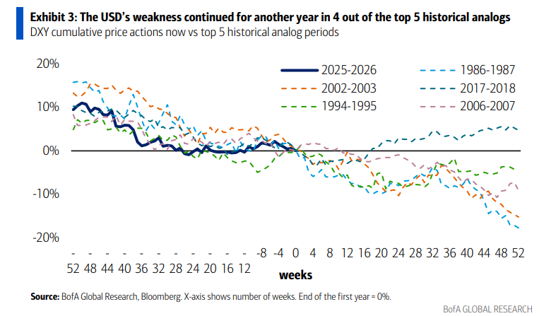 核心观点 - 美银美林基于历史量化分析认为,美元在2025年大幅下跌后,其跌势在2026年大概率将持续 [1][3] 历史回测与量化分析 - 对自1975年以来的数据进行回测,发现与2025年美元走势相关性最高的前5个历史参照年份中,有4次在随后一年继续下跌 [2] - 这前5个参照年份与2025年美元价格走势的平均相关性高达81% [6] - 在这些参照年份的第二年,美元平均进一步下跌8.3% [6] - 即使将范围扩大到前10个参照年份,美元在第二年下跌的概率仍高达70%,平均跌幅为5.5% [6] 2026年基准预测与关键参照年份 - 美银的基准外汇观点是美元在2026年将进一步走弱 [3] - 在所有参照年份中,1995年对2026年最具参考价值 [5] - 1995年与当前宏观背景相似:科技驱动增长实现软着陆,美联储在通胀接近3%时仍选择降息 [7] - 仅参考1995年走势,暗示美元在2026年将有4.2%的下行空间,这与美银预测美元指数将跌至95左右的观点吻合 [8] 驱动美元走弱的基本面因素 - 美联储主席鲍威尔之后的美国与全球利率趋同 [3] - 欧元区及中国的经济刺激措施 [3] - 针对美元资产的外汇对冲活动增加 [3] - 美银预计2026年美国经济将“蒙混过关”,美联储将在年中之后进一步降息 [7] - 预计欧元区增长将进一步复苏,且随着中美贸易战缓和,亚洲增长前景被上调,美元缺乏逆转跌势的基本面支撑 [9] 股市资金流向的驱动作用 - 外汇市场的驱动逻辑正从“纯利率驱动”转向“股市驱动” [10] - 尽管美股在2026年初创下新高,但其涨幅落后于大多数全球股市 [10] - 如果“全球股市跑赢美股”的趋势持续,这种股票表现差异将成为2026年做空美元的主要驱动力 [12] 美元逆转跌势的苛刻条件 - 历史数据显示,要逆转美元跌势需要极其苛刻的条件,例如2018年的情况 [9] - 2018年美元逆转的条件包括:美联储重新加息,以及欧元区、中国等主要经济体遭遇增长冲击 [13] - 美银对2026年的预期与这些条件相反,因此认为美元缺乏逆转支撑 [9]