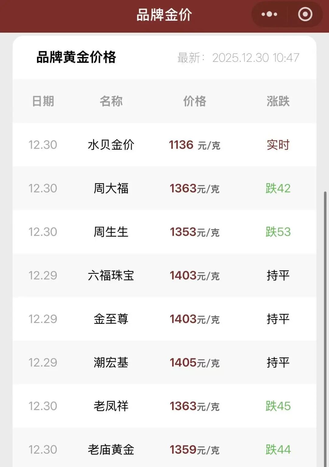 作者丨 特约评论员吴金铎 编辑丨陆跃玲 12月30日,国内黄金饰品价格对比显示,多家黄金珠宝品牌公布的境内足金首饰价格较昨日均大幅回调,老凤祥报价1363元/克,老庙黄金报 价1359元/克,周生生报价1353元/克,周大福报价1363元/克,六福珠宝报价1403元/克。 | | | 品牌金价 | . . . | | --- | --- | --- | --- | | 品牌黄金价格 | | | 最新:2025.12.30 10:47 | | 日期 | 名称 | 价格 | 涨跌 | | 12.30 | 水贝金价 | 1136 元/克 | 实时 | | 12.30 | 周大福 | 1363元/克 | 跌42 | | 12.30 | 周生生 | 1353元/克 | 跌53 | | 12.29 | 六福珠宝 | 1403元/克 | 持平 | | 12.29 | 我幸堂 | 1403元/克 | 持平 | | 12.29 | 潮宏基 | 1405元/克 | 持平 | | 12.30 | 老凤祥 | 1363元/克 | 跌45 | | 12.30 | 老庙黄金 | 1359元/克 | 跌44 | 近日,国际贵金属行情出现较 ...