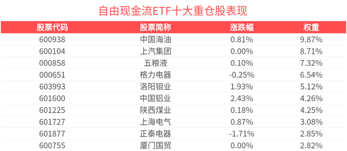 自由现金流ETF紧密跟踪国证自由现金流指数,国证自由现金流指数反映沪深北交易所自由现金流水平较高且稳定性较好的上市公司证券价格变化情况。数 据显示,截至2025年12月31日,国证自由现金流指数前十大权重股分别为中国海油、上汽集团、格力电器、中远海控、中国铝业、宝钢股份、长城汽车、正 泰电器、中国联通、潍柴动力,前十大权重股合计占比51.95%。 | 股票代码 | 股票简称 | 涨跌幅 | 权重 | | --- | --- | --- | --- | | 600938 | 甲国海海 | -0.20% | 9.87% | | 600104 | 上汽集团 | -2.65% | 8.71% | | 000858 | 五粮液 | -0.89% | 7.32% | | 000651 | 格力电器 | -0.32% | 6.54% | | 603993 | 洛阳钼业 | 2.19% | 5.12% | | 601600 | 中国铝业 | -2.43% | 4.26% | | 601225 | 陕西煤业 | -0.53% | 4.25% | | 601727 | 上海电气 | 1.31% | 3.08% | | 60187 ...