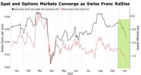 期权交易数据突显了这一需求情况。来自存托信托与清算公司的数据显示,周五欧元兑瑞士法郎的交易 量达到了自8月以来的最高水平,而美元兑瑞士法郎的交易量则达到了一个月来的最高值。 由于新的关税和政治方面的担忧引发避险需求,瑞士法郎兑欧元汇率正逼近十年来的高位。欧元兑瑞士 法郎汇率在周一达到0.92146,目前距离2015年1月的水平仅相差约0.2%。 在过去一个月里,该货币是十国集团中唯一一种对美元升值的货币。这是因为贸易保护主义担忧再度加 剧、法国和日本的政治局势不稳定,以及美国地区性银行面临新的压力等因素的影响。 经济学家们已基本放弃了回归负利率的想法(这与货币市场定价相一致),但该央行拥有多种政策选择, 以在应对进口型反通胀与外部冲击之间寻求平衡。 丹麦银行的分析师们认为,瑞士央行在考虑实行负利率之前,更倾向于采取干预措施。他们指出,瑞士 法郎的实际贸易加权汇率走强以及对瑞士出口到美国商品的潜在关税措施,可能会进一步缓解价格压 力。尽管如此,他们预计欧元兑瑞郎汇率在未来一年将呈下跌趋势。 法兴银行策略师Kit Juckes表示:"与欧元和英镑相比,挪威克朗和瑞典克朗(具有更强的增长潜力)以及 瑞士法郎(具有避 ...