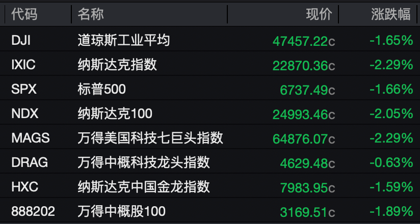 昨夜(11月13日),全球金融市场全线大跌。 美股三大指数集体收跌。道琼斯指数跌1.65%,标普500指数跌1.66%,纳斯达克综合指数跌2.29%。科技股重挫,特斯拉跌超6%,英特尔跌超5%, AMD、甲骨文跌超4%,英伟达跌超3%,亚马逊、谷歌跌超2%。 热门中概股多数下跌,纳斯达克中国金龙指数收跌1.59%。百度跌超6%,哔哩哔哩跌超4%,小鹏汽车、蔚来跌超3%。 | 代码 | 名称 | 现价 | 涨跌幅 | | --- | --- | --- | --- | | DJI | 道琼斯工业平均 | 47457.22c | -1.65% | | IXIC | 纳斯达克指数 | 22870.36c | -2.29% | | SPX | 标普500 | 6737.49c | -1.66% | | NDX | 纳斯达克100 | 24993.46c | -2.05% | | MAGS | 万得美国科技七巨头指数 | 64876.07c | -2.29% | | DRAG | 万得中概科技龙头指数 | 4629.48c | -0.63% | | HXC | 纳斯达克中国余龙指数 | 7983.95c | -1.59 ...