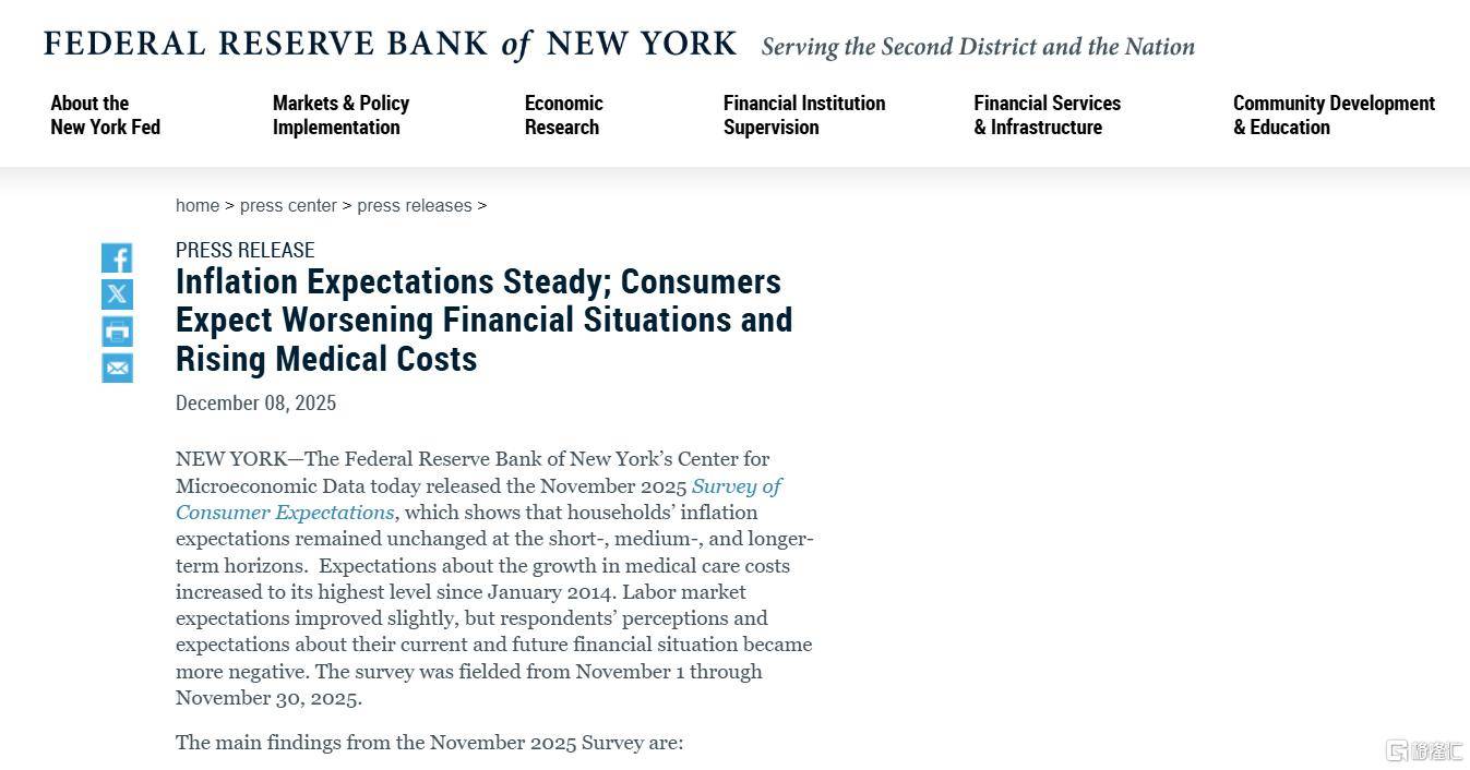 当地时间12月8日,纽约联储公布的最新调查结果显示,美国消费者对11月的通胀预期保持稳定,家庭对当前及未来财务状况的看法更加悲观。 消费者对医疗费用增长的预期升至自2014年1月以来的最高水平,同时对就业前景的看法有所改善。 具体来看,消费者对于 未来一年的通胀预期为3.2%, 几乎没有变化; 对未来三年和五年的通胀预期维持在3%。 受访者们认为,失业概率下滑 至13.8%,且为今年最低水平。 通胀预期持稳 报告显示,消费者对于未来一年的通胀预期保持不变,为3.2%;对未来三年和五年的通胀预期保持稳定,维持在3%。 受访者对于房价的预期同样保持稳定,预计未来房价保持上涨3.0%不变。 食品的价格展望上涨5.9%,汽油价格上涨4.1%,大学教育费用上涨8.4%,租金上涨8.3%。 这些生活必需品价格的上涨,是消费者感受到财务压力上升的核心原因。 值得一提的是,受访者预计未来一年医疗成本上涨至10.1%,且为2014年1月以来的最高值。 劳动力市场方面,消费者对于未来一年失业率上升的担忧稍有缓解,对未来一年失去工作的预期降至自2024年12月以来的最低水平。 同时,预计主动离职的概率也有所下降,还表示如果失业后找 ...