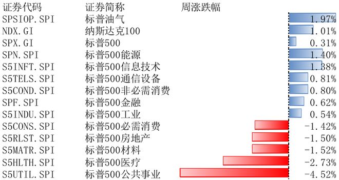 来源:市场投研资讯 (来源:博时基金) 一、美国宏观经济数据 美国12月密歇根大学消费者信心指数初值录得52.3%,好于预期值52%和前值51%。美国12月密歇根大 学1年通胀预期初值录得4.1%,低于预期值和前值4.5%;美国12月密歇根大学5年通胀预期初值录得 3.2%,低于预期值和前值3.4%。 二、主要指数相关情况 1、 一周指数表现 上周(12月1日-5日),标普油气指数整周上涨1.97%,纳斯达克100指数整周上涨1.01%,标普500指数 整周上涨0.31%,其覆盖的11个行业板块有6个上涨,其中标普500能源领涨1.40%,标普500公共事业领 跌4.52%。 | 数据来源:Wind,指数历史表现不预示未来收益 | | --- | 美国9月PCE物价指数在预期内维持高位,但个人消费支出环比增幅边际回落。美国9月PCE物价指数同 比上涨2.8%持平预期,高于前值2.7%;美国9月PCE物价指数环比上涨0.3%,持平预期和前值。美国9 月核心PCE物价指数同比上涨2.8%,持平预期,低于前值2.9%;美国9月核心PCE物价指数环比上涨 0.2%,持平预期和前值。美国9月个人消费支出环比上涨0.3% ...