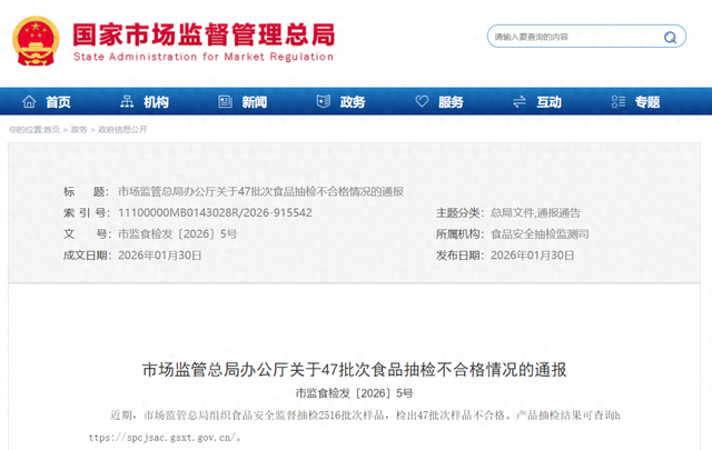 食品安全抽检总体情况 - 庆云县市场监督管理局在2026年度第1期食品安全监督抽检中 对包括方便食品 薯类和膨化食品 水果制品 蔬菜制品 豆制品 糕点 糖果制品 淀粉及淀粉制品 粮食加工品 肉制品 乳制品 食用农产品 酒类 餐饮食品 饮料 调味品 饼干在内的共17大类食品进行了抽检 合计140批次[3] - 抽检结果显示 合格产品131批次 不合格产品9批次 总体合格率为93.6%[3] - 不合格产品存在的主要问题是农药残留超标 具体为噻虫胺 联苯菊酯等检验项目不符合国家食品安全标准要求[3] 不合格产品具体信息 - 不合格产品全部为食用农产品 涉及辣椒 茄子 桔子 马铃薯 姜等品类[3] - 被抽检单位包括庆云县天庆万家福商业管理有限公司 庆云县尚堂镇王国胜烟酒副食门市部 庆云庆悦酒楼饭店 庆云县宝发祥园超市门市部 庆云县猛硕小吃部 庆云县吉真超市 庆云县中商昆仑商贸有限公司等[3] - 具体不合格项目及超标情况如下: - **噻虫胺超标**:辣椒检出0.13mg/kg(标准值≤0.05mg/kg)超标160%[3];茄子检出0.068mg/kg(标准值≤0.05mg/kg)超标36%[3];辣椒检出0.12mg/kg(标准值≤0.05mg/kg)超标140%[3];姜检出0.29mg/kg(标准值≤0.2mg/kg)超标45%[3];姜检出0.30mg/kg(标准值≤0.2mg/kg)超标50%[3] - **联苯菊酯超标**:桔子检出0.11mg/kg(标准值≤0.05mg/kg)超标120%[3];桔子检出0.25mg/kg(标准值≤0.05mg/kg)超标400%[3] - **毒死蜱超标**:马铃薯检出0.048mg/kg(标准值≤0.02mg/kg)超标140%[3];马铃薯检出0.059mg/kg(标准值≤0.02mg/kg)超标195%[3] 合格产品与市场流通情况 - 本次抽检的合格产品信息表列示了131批次产品 覆盖了广泛的食品品类和品牌[4][5][6][7][8][9][10] - 合格产品中包括多个知名品牌 如**旺仔牛奶**(淮安旺旺食品有限公司/山东旺旺食品有限公司)[4][9] **可口可乐**(中粮可口可乐饮料(济南)有限公司)[5][8] **燕京啤酒**(燕京啤酒(曲阜三孔)有限责任公司)[9] **恒顺白醋**(江苏恒顺醋业股份有限公司)[9] **莲花味精**(莲花健康产业集团食品有限公司)[8] **今麦郎**(今麦郎食品股份有限公司/今麦郎饮品股份有限公司隆尧分公司)[9] **金沙河挂面**(邢台金沙河面业有限责任公司)[5] **银鹭饮料**(山东银鹭食品有限公司)[10] **喜之郎果冻**(河北喜之郎食品有限公司)[5] **巧媳妇酱油**(山东巧媳妇食品集团有限公司)[6][8]等 - 被抽样单位类型多样 包括大型商业管理公司(如庆云县天庆万家福商业管理有限公司)[4] 连锁超市 便民超市 个体烟酒副食门市部 饭店酒楼 小吃部 学校食堂等 反映了当地食品流通和消费的主要渠道[4][5][6][7][8][9][10] 监管行动与行业影响 - 对于公告附件所列的不合格产品及其生产经营企业 庆云县市场监督管理局已依法组织进行查处[3] - 此次抽检结果突显了在食用农产品 特别是蔬菜水果的种植或储运环节 农药残留控制仍是食品安全监管的重点领域 相关农业生产资料和农产品初加工行业需持续加强合规管理[3] - 大量知名品牌产品通过抽检 显示了主流食品生产企业在质量控制体系上的有效性 有助于维护消费者信心和品牌声誉[4][5][6][7][8][9][10]