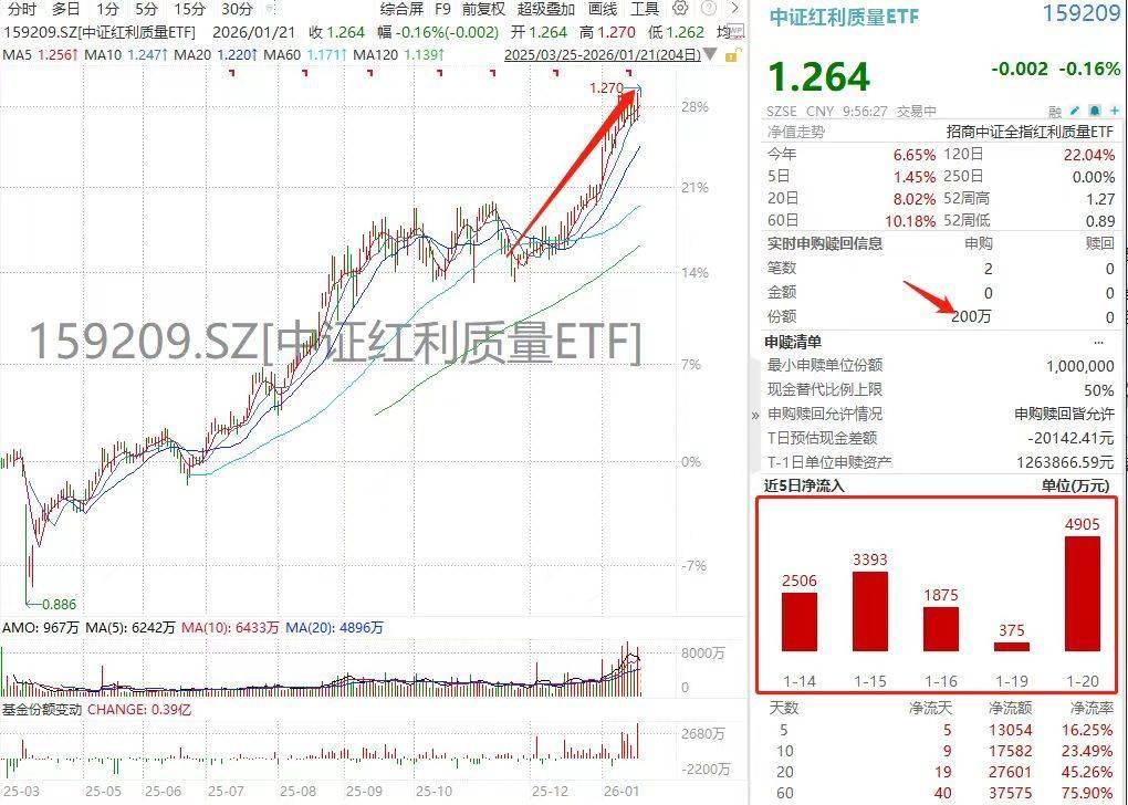 净流入9连阳!两市唯一的中证红利质量ETF(159209)新高不止,揽金不停