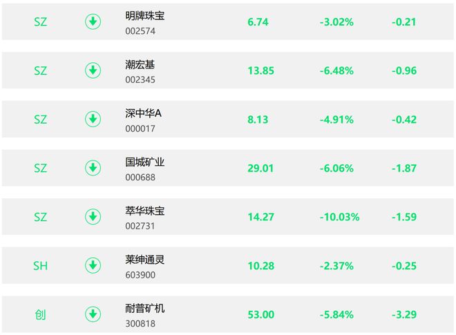 | SZ | 明牌珠宝 | 6.74 | -3.02% | -0.21 | | --- | --- | --- | --- | --- | | | 002574 | | | | | SZ | 潮宏基 | 13.85 | -6.48% | -0.96 | | | 002345 | | | | | SZ | 深中华A | 8.13 | -4.91% | -0.42 | | | 000017 | | | | | SZ | 国城矿业 | 29.01 | -6.06% | -1.87 | | | 000688 | | | | | SZ | 琴华珠宝 | 14.27 | -10.03% | -1.59 | | | 002731 | | | | | SH | 菜绅通灵 | 10.28 | -2.37% | -0.25 | | | 603900 | | | | | 创 | 耐普矿机 | 53.00 | -5.84% | -3.29 | | | 300818 | | | | 1月29日早盘,黄金概念股突然快速跳水。截至09:51,萃华珠宝跌停,耐普矿机跌超7%,潮宏基、国 城矿业、深中华A、明牌珠宝、莱绅通灵等跟跌。 ...