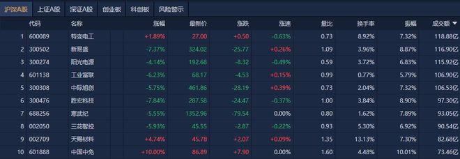 市场整体表现 - 市场早盘震荡下跌,创业板指数跌幅超过2%,达2.13%,深成指跌0.59%,沪指微跌0.03% [1] - 市场出现明显分化,全市场超过2900只个股上涨,但黄白线分化显著 [1] - 沪深两市半日成交额达1.44万亿元,较上个交易日放量1875亿元 [2] 板块热点轮动 - 锂电池板块反复活跃,天际股份等多只股票涨停 [1] - 磷化工概念延续强势,澄星股份实现3连板 [1] - 大消费板块爆发,免税店和食品饮料方向领涨,中国中免、惠发食品、会稽山等多股涨停 [1] - 算力硬件概念股集体走弱,新易盛、胜宏科技等股价大跌 [1] - 人形机器人概念重挫,浙江荣泰股价触及跌停 [1] 个股成交活跃度 - 特变电工成交额居首,超过118亿元,股价上涨0.50元至27.00元,涨幅1.89% [3] - 新易盛成交额116.90亿元,股价大跌25.77元至324.02元,跌幅7.37% [3] - 阳光电源成交额115.92亿元,股价下跌8.32元至192.68元,跌幅4.14% [3] - 工业富联成交额106.90亿元,股价下跌4.53元至68.17元,跌幅6.23% [3] - 中国中免涨停,股价上涨7.90元至69.99元,涨幅10.00%,成交额73.46亿元 [3]