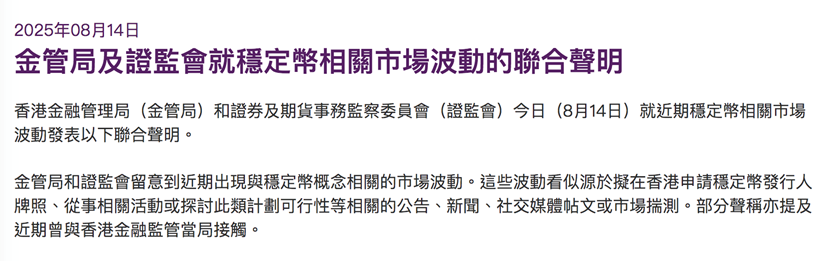 香港金管局、香港证监会联合呼吁:对稳定币市场波动保持谨慎