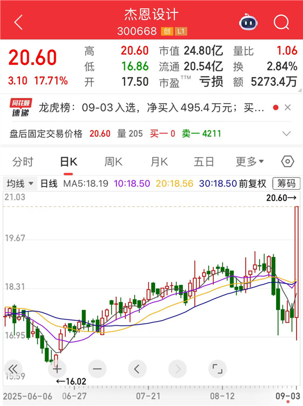 (原标题:300668尾盘异动,突现大额买单!半导体行业新消息,新凯来将参会,概念股提前火了) 半导体板块再起波澜。 9月3日尾盘集合竞价阶段,杰恩设计(300668)股价直线拉升,该股3分钟内成交1.17万手,股价由跌超 3%瞬间拉升至17.71%,收出一根大阳线。 值得注意的是,杰恩设计9月3日成交5273.4万元,收盘时最后一笔成交额达到2417.4万元,占当天成交 额的比例达到45.84%。对于公司股价突然的异动,不少投资者在财经论坛发出"什么情况"等疑惑的帖 子。 公开资料显示,杰恩设计主要从事市场商务及服务支持业务、室内设计业务。今年上半年,公司实现营 业总收入2.34亿元,同比下滑8.65%;净利润亏损58.87万元,相比去年同期由盈转亏。 新凯来将参加半导体重要展会 2025年9月4日至6日,第十三届半导体设备与核心部件及材料展(CSEAC 2025),将在无锡太湖国际博览 中心举行,今年展会主题是"做强中国芯,拥抱芯世界"。 CSEAC以"专业化、产业化、国际化"为宗旨,是我国半导体设备与核心部件及材料领域最具知名度的 年度性展会。本届展会目前已有来自欧洲、亚太等22个国家和地区的150多家 ...