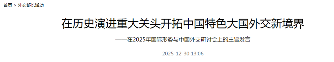 各位专家,各位朋友: 大家好!很高兴岁末年初再次相聚,一道探讨国际形势,盘点中国外交。 2025年是世界反法西斯战争胜利80周年,也是联合国成立80周年。在这个厚重的历史性年份,世界再次来到何去何从的重要关口。 在历史演进重大关头开拓中国特色大国外交新境界 ——在2025年国际形势与中国外交研讨会上的主旨发言 王 毅 (2025年12月30日,北京) 这一年,国际格局演变走向重要分水岭,单极霸权不得人心,多极世界扑面而来,百年变局下的新旧矛盾集中暴发,进步还是倒退之争日趋激烈。 这一年,经济全球化遭遇严重冲击,关税战破坏国际贸易规则,扰乱全球经济秩序,开放还是封闭之选迫在眉睫。 这一年,全球局部战争和跨境冲突频发,创下二战结束以来新高,地缘政治动荡持续蔓延,和平还是战争之问扣动人心。 面对历史演进新关口,我们在以习近平同志为核心的党中央坚强领导下,高举构建人类命运共同体旗帜,以元首外交为战略引领,用最大诚意团结世界进 步力量,尽最大努力汇聚和平发展能量,保和平、促合作、应变局、担道义,为中华民族谋复兴,为动荡世界谋大同,不断开创中国特色大国外交新境 界。 面对世界和平乱局,中国是稳定锚。百年变局加速演进,国际 ...