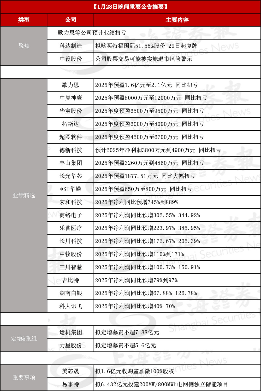 今日看点 ▼聚焦一:歌力思等多家公司预计业绩扭亏 | | | 【1月28日晚间重要公告摘要】 | | --- | --- | --- | | 类型 | 公司 | 主要内容 | | | 歌力思等公司预计业绩扭亏 | | | 聚焦 | 科达制造 | 拟购买特福国际51.55%股份 29日起复牌 | | | 中设股份 | 公司股票交易可能被实施退市风险警示 | | | 超图软件 | 2025年度预盈4500万至6700万元 同比扭亏 | | | 歌力思 中复神鹰 | 2025年预盈1.6亿元至2.1亿元 同比扭亏 2025年预盈8000万元至12000万元 同比扭亏 | | | 华宝股份 | 2025年度预盈6500万至9500万元 同比扭亏 | | | 拓斯达 | 2025年度预盈6000万至8000万元 同比扭亏 | | | 丰山集团 | 2025年预盈3260万元到4860万元 同比扭亏 | | | 德新科技 | 预计2025年净利润3800万元到4900万元 同比扭亏 | | | 长光华芯 | 2025年预盈1877.51万元 同比大幅扭亏 | | 业绩精选 | *ST华嵘 | 2025年预盈650万至80 ...
