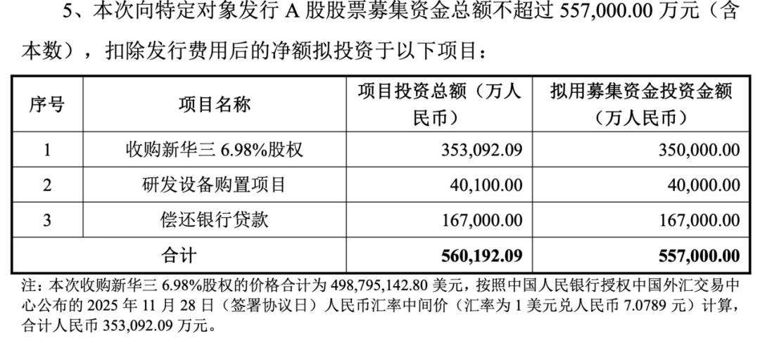 公司融资计划 - 紫光股份拟向特定对象发行A股募集资金不超过55.7亿元人民币[1] - 本次发行股票数量不超过4.3亿股[1] - 公司同时终止发行H股股票并在香港联交所主板上市的计划[1][6] 募集资金用途 - 募集资金净额拟用于三个项目:收购新华三6.98%股权、研发设备购置项目及偿还银行贷款[1] - 具体投资金额为:收购新华三股权35亿元人民币、研发设备购置4亿元人民币、偿还银行贷款16.7亿元人民币[2] - 项目投资总额合计为56.019209亿元人民币,拟使用募集资金55.7亿元人民币[2] 收购新华三股权的影响 - 收购新华三6.98%股权旨在提升上市公司对新华三的控制权并增厚盈利水平[2] - 自2016年收购新华三51%股权后,公司资产质量、收入及利润规模均大幅提升[2] - 2024年9月公司完成收购新华三30%股份,目前通过紫光国际持有新华三81%股权[2] - 此次收购有助于提升归属于母公司股东的净利润规模,巩固并提升公司的持续经营能力[2] 研发投入与行业机遇 - 公司所处行业正处于技术快速迭代与市场格局重塑的关键窗口期[3] - 面对人工智能、云计算、大数据等新一代数字技术融合趋势和数字经济深化发展带来的机遇,公司需要持续加大研发投入[3] - 部分募集资金将用于采购下一代ICT基础设施研发相关设备,以提升研发能力、加速科技创新、确立竞争优势并扩大市场份额[3] 优化财务结构 - 2024年9月,公司使用自有资金及并购贷款购买新华三30%股权,导致资产负债率增加[3] - 截至2025年9月30日,紫光股份的资产负债率增加至80%以上的水平[3] - 本次发行旨在增加公司净资产,并通过偿还银行贷款以缓解资金压力、降低资产负债率和财务费用,优化财务结构[3] 新华三经营状况 - 新华三提供全方位的数字化基础设施整体能力及一站式数字化解决方案[4] - 截至2025年9月30日,新华三资产总额为571.385351亿元人民币[4][5] - 2025年前三季度,新华三实现营业收入596.22756亿元人民币,净利润为25.285119亿元人民币[4][5] - 2024年度,新华三营业收入为550.740398亿元人民币,净利润为28.062245亿元人民币[5] 终止H股发行的影响 - 终止发行H股股票是基于公司战略发展规划,为维护股东利益而作出的审慎决定[9] - 该事项预计不会对公司的经营活动造成重大影响[9] 公司基本情况 - 紫光股份立足新一代信息通信领域,提供全栈智能化的ICT基础设施、云与智能平台及行业解决方案[9] - 截至2月11日收盘,紫光股份股价报25.13元/股,总市值为719亿元人民币[9]