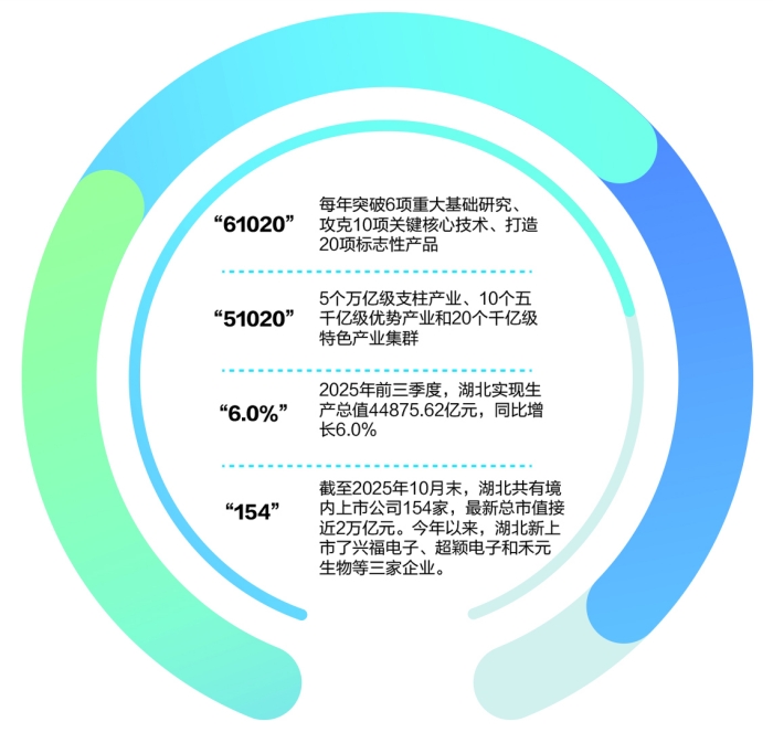 | "61020" | 每年突破6项重大基础研究、 攻克10项关键核心技术、打造 | | --- | --- | | | 20项标志性产品 | | | 5个万亿级支柱产业、10个五 | | "51020" | 干亿级优势产业和20个干亿级 | | | 特色产业集群 | | | 2025年前三季度,湖北实现生 | | "6.0%" | 产总值44875.62亿元,同比增 156.0% | | | 截至2025年10月末,湖北共有境 | | "154" | 内上市公司154家,最新总市值接 | | | 近2万亿元。今年以来,湖北新上 | | | 市了兴福电子、超颖电子和未元 | | | 生物等三家企业。 | 湖北有"数" ...