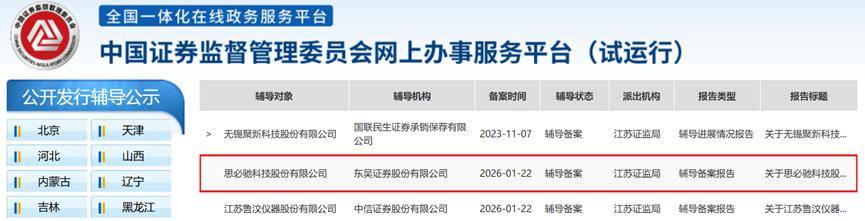 近日,据中国证券监督管理委员会网上办事服务平台信息显示,江苏证监局受理了思必驰科技股份有限公司提交的首次公 开发行股票并上市辅导备案的申请,备案时间为2026年1月22日,辅导机构为东吴证券。 据辅导备案报告披露,东吴证券与思必驰辅导协议签署时间为2026年1月9日。另外,参与辅导工作的证券服务机构还包括 北京市金杜律师事务所及天健会计师事务所(特殊普通合伙)。 | 辅导协议签署时间 2026年1月9日 | | --- | | 辅 导 机 构 东吴证券股份有限公司 | | 律 师 事 务 所 北京市金杜律师事务所 | | 会 计 师 事 务 所 天健会计师事务所(特殊普通合伙) | 实际上,2025年4月25日江苏证监局就受理了思必驰首次公开发行股票并上市辅导备案的申请,当时的辅导机构为中信证 券。 | | 全国一体化在线政务服务平台 | | | | | | | --- | --- | --- | --- | --- | --- | --- | | | 中国证券监督管理委员会网上办事服务平台(试运行) | | | | | | | 公开发行辅导公示 | | 辅导对象 | 辅导机构 | 备案时间 辅导状态 | 派 ...