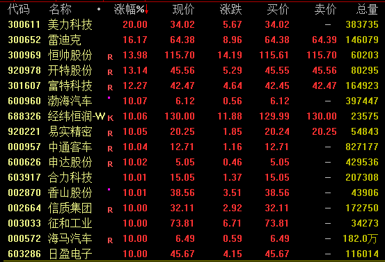 港股方面,中国人寿涨超6%,华虹半导体、京东健康、商汤等涨超5%,小鹏汽车、阿里巴巴等涨约 4%。 汽车产业链股拉升 汽车产业链股盘中发力走高,截至收盘,美力科技20%涨停,雷迪克涨超16%,恒帅股份、开特股份涨 超13%,渤海汽车、中通客车、香山股份、海马汽车等均涨停。 炒股就看金麒麟分析师研报,权威,专业,及时,全面,助您挖掘潜力主题机会! 15日,A股早盘震荡回落,午后全线拉升,沪指重返3900点上方,创业板指收复3000点大关;港股亦走 高,恒生指数涨近2%。 具体来看,两市股指午后在保险、券商、医药、酿酒等板块带动下强势上扬,沪指涨超1%,创业板指 涨超2%。截至收盘,沪指涨1.22%报3912.21点,深证成指涨1.73%报13118.75点,创业板指涨2.36%报 3025.87点,上证50、科创50、北证50指数等均涨超1%,沪深北三市合计成交20907亿元,较此前一日 减少逾5000亿元。 场内超4300股飘红,市场热点继续切换,医药、消费类股崛起。汽车产业链股拉升,美力科技、香山股 份、征和工业等涨停;医药股反弹,向日葵、昂利康等涨停,广生堂大涨超17%;纺织服装、零售、食 品饮料等板块均 ...