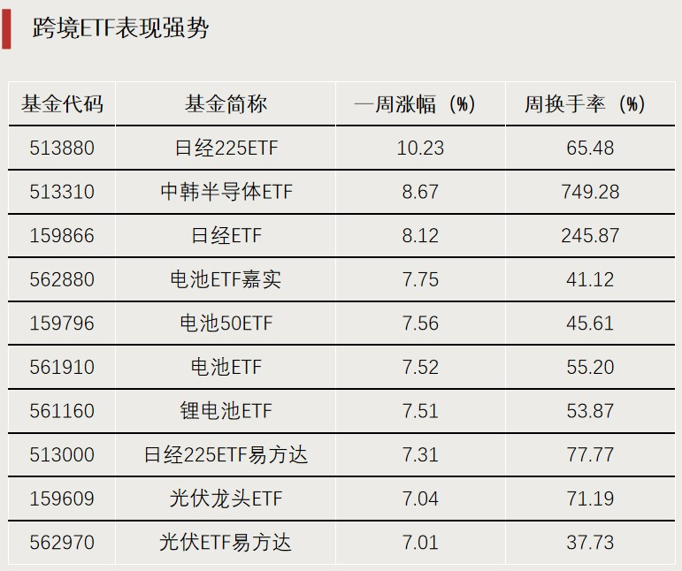 01 上周(10月27日至31日),日经225ETF、中韩半导体ETF和日经ETF等跨境ETF领涨;投资A股的ETF中,电池 主题ETF和光伏主题ETF涨幅居前。科创芯片主题ETF回调,多只产品跌超5%。 02 资金净流入方面,上周,与中证A500指数挂钩的ETF资金合计净流入超45亿元。A500ETF易方达(159361)等 多只宽基ETF以及科创债ETF"吸金"。跟踪中证A500指数、科创50指数、沪深300指数的宽基指数ETF,以及跟 踪香港证券指数、恒生科技指数、纳斯达克100指数的跨境ETF成交额较大。 一周ETF涨幅榜 上周(10月27日至31日),跨境ETF领涨。日经225ETF周涨幅达10.23%,中韩半导体ETF和日经ETF周涨幅均 超8%。 | 基金代码 | 基金简称 | 周资金净流入额 | 日均成交额 | | --- | --- | --- | --- | | | | (亿元) | (亿元) | | 510300 | 沪深300ETF | 58.93 | 42.25 | | 159111 | 科创债ETF天弘 | 44.63 | 58.57 | | 159816 | 0-4地债ETF | ...