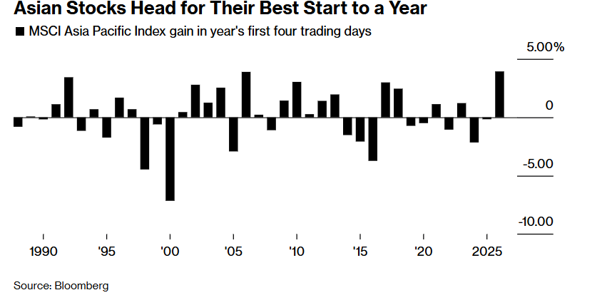 亚洲股市整体表现 - MSCI亚太基准指数在2026年开年累计上涨约4%,创下自1988年有记录以来最强劲的年初交易日表现[1] - 亚洲地区主权货币的一项指标录得自2023年以来最佳年度开局,以美元计价的亚洲市场公司债基准指数也同步上涨[1] - 亚洲股市的强劲走势凸显出该地区对全球投资者日益增强的吸引力,全球资金动态指向亚洲科技股仍有进一步上行空间[4] 韩国股市 - 韩国Kospi综合指数2026年初累计涨幅高达8%,成功突破4500点创纪录点位[2] - 2025年韩国股市创下25年来最强劲涨幅,其中三星电子和SK海力士贡献了近一半的涨幅[3] - 花旗集团、摩根大通与野村等华尔街券商预测韩国基准股指明年至少还会再上涨20%[3] - 野村证券将三星电子和SK海力士的12个月内目标股价进一步上调,强调未来股价上行空间将超过40%[3] 存储芯片行业 - 野村证券研究报告显示,始于2025年下半年的“存储超级周期”至少将延续至2027年,有意义的新增供给最早要到2028年初才会出现[3] - 全球存储芯片领军者SK海力士与三星电子是推动韩国股市上涨的关键,这两家公司合计占韩国基准股指权重的30%以上[2] - “存储芯片超级周期”所主导的强劲盈利增长趋势预计将继续支撑韩国股市的牛市[3] 中国台湾股市与台积电 - 以科技股为主的中国台湾Taiex指数2026年以来跳涨约5.6%,持续升至创纪录高位[4] - 台积电台股股价在周一一度飙升6.9%,创下历史新高,推动中国台湾股市基准指数突破3万点关口[4] - 高盛将台积电的12个月内目标价大幅上调35%至2330新台币[4] - 台积电作为全球最大合同芯片代工厂商,其客户英伟达、AMD、博通等芯片巨头对AI芯片的激增需求推动台积电业绩持续超预期扩张[5] 中国A股市场 - 上证指数截至周二收盘创2015年7月底以来新高,豪取十三连阳,创史上最长连阳纪录,2026年以来涨幅高达2.8%[6] - 创业板指数2026年以来涨幅接近4%[6] - A股强劲涨势主要受市场对中国AI应用进展的持续乐观情绪以及“国产替代”热潮下的AI算力产业链强劲表现驱动[6] - 在“国产替代”热潮下,A股市场的多只AI算力产业链领军者与芯片龙头股股价屡创历史新高,业绩同步大增[6] AI投资主题与估值 - 投资者在估值高企的美国股市之外积极寻找投资机遇,尤其是与AI投资主题密切相关的机遇[1] - 亚洲等新兴市场股市将受益于非常具有吸引力的估值以及位列全球AI算力产业链的最核心地位[2] - 亚洲AI算力产业链上的核心科技公司估值相较于全球同行仍然非常便宜[6] - 全球AI资本开支超级周期及其相关生产率繁荣增长周期“仅仅走完不到一半”[6]