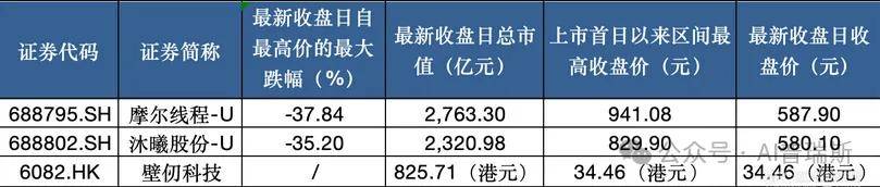 根据Wind披露的数据,上市后不久,摩尔线程、沐曦股份股价均出现明显回调,较各自阶段高点回落幅度已接近 40%;壁仞科技虽在港股上市首日虽表 现强势,但整体市值水平明显低于此前两家 A 股公司,首日涨75.82%,市值仅摩尔线程和沐曦的三分之一。短短一个月内,国产 GPU 板块完成了从"情 绪极热"到"理性降温"的切换。 | 证券代码 | 证券简称 | 最新收盘日自 最高价的最大 | | 最新收盘目总市 上市首日以来区间最 | 最新收盘日收 | | --- | --- | --- | --- | --- | --- | | | | 跌幅(%) | 值(亿元) | 高收盘价(元) | 盘价(元) | | 688795.SH | 摩尔线程-U | -37.84 | 2,763.30 | 941.08 | 587.90 | | 688802.SH | 沐曦股份-U | -35.20 | 2,320.98 | 829.90 A | 1 580.10 | | 6082.HK | 壁仞科技 | | 825.71 (港元) | 34.46 (港元) | 34.46 (港元) | 截止截图时间,摩尔线程报每股614.2元,总 ...