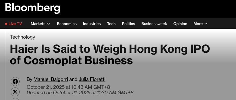 据知情人士透露,海尔此次拟通过卡奥斯IPO募集的5亿美元资金,将主要用于技术研发、市场拓展及生态建设。 目前,海尔集团已拥有海尔智家(A股+H股)、海尔生物、盈康生命等七家上市公司,覆盖家电、生物科技、医疗健康等领 域。(青山) 【环球网科技综合报道】10月21日,彭博社援引知情人士消息报道,海尔集团正与中金公司、汇丰银行接洽,计划推动其旗下 工业互联网平台卡奥斯COSMOPlat于2026年在香港联合交易所主板上市,预计通过此次IPO筹集约5亿美元资金(约合35.49亿元 人民币)。 卡奥斯COSMOPlat由海尔集团于2017年4月创立,依托海尔近40年制造经验,首创以大规模定制为核心、用户全流程参与的工业 互联网模式。 ...