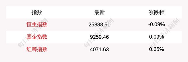 (记者 王瀚黎) 每经AI快讯:北京时间10月16日16:00,恒生指数收盘下跌22.09点,跌幅为0.09%,报收25888.51点;国 企指数收盘上涨8.55点,涨幅为0.09%,报收9259.46点;红筹指数收盘上涨26.13点,涨幅为0.65%,报 收4071.63点。南向资金当日净流入158.22亿港元。 | 指数 | 最新 | 涨跌幅 | | --- | --- | --- | | 日午前十四 | 25888.51 | -0.09% | | 国企指数 | 9259.46 | 0.09% | | 红筹指数 | 4071.63 | 0.65% | 免责声明:本文内容与数据仅供参考,不构成投资建议,使用前请核实。据此操作,风险自担。 ...