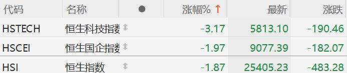 港股指数表现 - 恒生科技指数下跌3.17%,收报5813.10点,下跌190.46点 [1] - 恒生指数下跌1.87%,收报25405.23点,下跌483.28点 [1] - 恒生国企指数下跌1.97%,收报9077.39点,下跌182.07点 [1]
