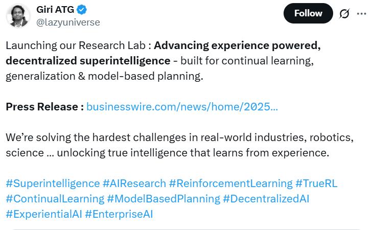 【导读】过去两年,AI靠模仿人类席卷世界。但强化学习之父Richard Sutton却说:「GenAI的时代正在结束。」他带着图灵奖的荣光,加入一家几乎没 人听过的公司——ExperienceFlow.AI,他要让AI不靠人类数据喂养,而靠「经验」觉醒。 11月初,ExperienceFlow.AI的CEO Giri ATG在X上发出了这样一条消息。 没有精致海报,没有宣传视频, 但在短短几小时内,这条看似平静的公告,被AI研究员、投资人疯狂转发。 在铺天盖地的模型demo与发布会中,它像一根细微的地震针,预示着另一场更深层的震动。 因为加入这家初创公司的,不是普通的科学家,而是强化学习的开创者、「Reinforcement Learning: An Introduction」的作者、 刚刚获得2024年图灵奖的 Richard Sutton。 他编写的「Reinforcement Learning: An Introduction」被誉为AI研究的圣 经。 是他让AI第一次能够「从经验中学习」;如今,他回来了,要重新定义什么才叫「智能」。 强化学习教父归来:向生成式AI发起反击 在过去两年中,人工智能行业热 ...