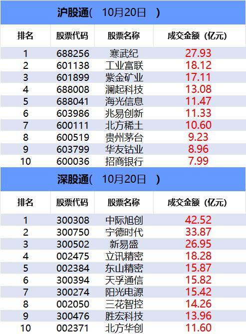 一、沪深股通前十大成交 今日沪股通总成交金额为1153亿,深股通总成交金额为1194.32亿。 | | | 沖股通( 10月20日 D | | | --- | --- | --- | --- | | 排名 | 股票代码 | 股票名称 | 成交金额(亿元) | | 1 | 688256 | 其武 | 27.93 | | 2 | 601138 | 工业富联 | 18.12 | | 3 | 601899 | 紫等处,不 | 17.11 | | 4 | 688008 | 澜起科技 | 13.08 | | 5 | 688041 | 海光信息 | 11.47 | | 6 | 603986 | 兆易创新 | 11.33 | | 7 | 600111 | 北方稀土 | 10.60 | | 8 | 600519 | 贵州茅台 | 9.23 | | 9 | 603799 | 华友错业 | 8.96 | | 10 | 600036 | 招商银行 | 7.99 | | | 深胺道( | 10月20日 | | | 排名 | 股票代码 | 股票名称 | 成交金额(亿元) | | 1 | 300308 | 中际旭创 | 42.52 | | ...