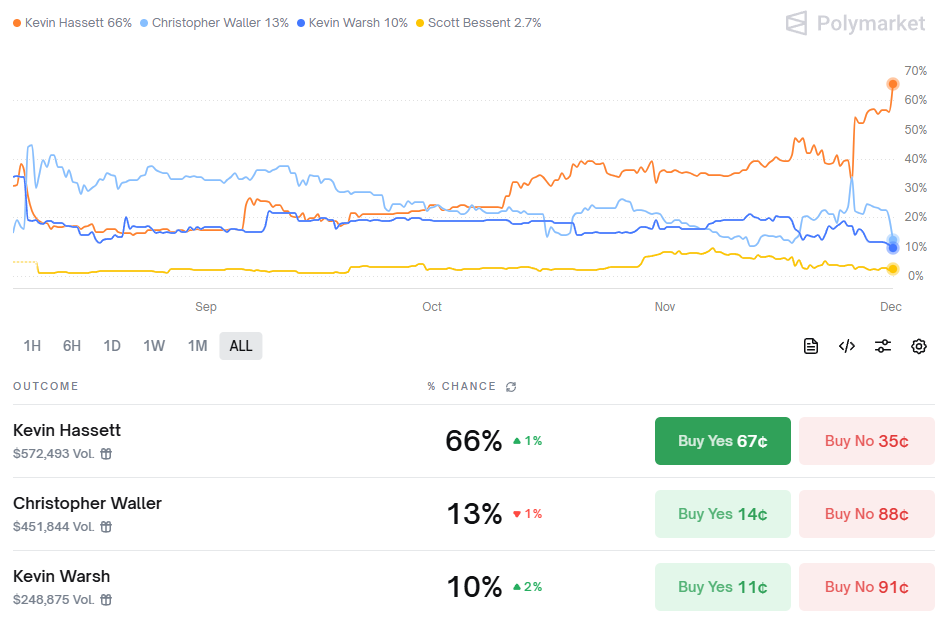 美联储主席提名进展与市场反应 - 美国总统特朗普已决定下任美联储主席人选,并确认将宣布此决定,但未透露具体姓名 [4] - 特朗普频繁批评现任主席鲍威尔未能迅速降息,并希望新主席能更积极推动降息 [4] - 财政部长贝森特表示,特朗普可能在12月25日圣诞节假期前宣布提名人选 [3][7] 主要候选人情况 - 白宫国家经济委员会主任凯文·哈塞特被视为接替鲍威尔的热门人选,在预测市场中以66%的概率领先 [1] - 知情人士透露,特朗普信任哈塞特,认为他在推动央行更积极降息的意愿上与自己一致,哈塞特已表示如果被邀请将接受职位 [7] - 其他入围候选人包括美联储理事克里斯托弗·沃勒和米歇尔·鲍曼、前美联储理事凯文·沃什以及贝莱德的里克·里德 [7] - 特朗普也经常表示希望财长贝森特担任主席,但贝森特已多次拒绝 [7] 市场反应与影响 - 特朗普决定新主席人选的消息引发市场积极反应,10年期美债收益率一度跌破4% [1][5] - 哈塞特强调市场反应“非常非常积极”,并指出美国国债拍卖表现强劲,利率下降 [1][3][6] - 哈塞特表示,这意味着美国民众可以期待获得更便宜的汽车贷款和更低的抵押贷款利率 [3] 提名程序与潜在挑战 - 无论特朗普选择谁,提名人都需要获得参议院对主席职位的确认 [7] - 如果人选来自美联储外部,还可能需要确认一个始于明年2月的14年美联储理事任期 [7] - 现任主席鲍威尔的任期将于明年5月结束 [3][7]