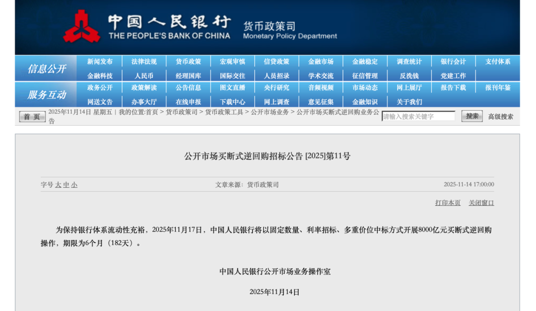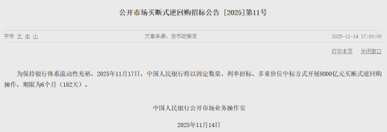 央广网北京11月14日消息(记者 冯方)11月14日,央行发布公告称,为保持银行体系流动性充裕,将 于2025年11月17日以固定数量、利率招标、多重价位中标方式开展8000亿元买断式逆回购操作,期限为 6个月(182天)。 根据央行此前公告,11月分别有7000亿元3个月期买断式逆回购和3000亿元6个月期买断式逆回购到期。 11月5日,央行已对3个月期买断式逆回购进行了等量续作。11月17日8000亿元6个月期买断式逆回购落 地后,11月两个期限品种的买断式逆回购合计将延续加量续作。 近日发布的《2025年第三季度中国货币政策执行报告》提到,目前,央行基本形成每月5号前后开展3个 月期买断式逆回购、15号前后开展6个月期买断式逆回购、25号开展1年期中期借贷便利(MLF)的中 长期资金投放模式。 东方金诚首席宏观分析师王青对央广财经记者表示,央行通过买断式逆回购向银行体系注入中期流动 性,有助于保持资金面处于较为稳定的充裕状态。这能够助力政府债券发行,引导金融机构加大货币信 贷投放力度。当前央行更大规模加量续作买断式逆回购,释放了数量型政策工具持续加力的信号,显示 货币政策延续支持性立场,有助于稳增长、稳 ...