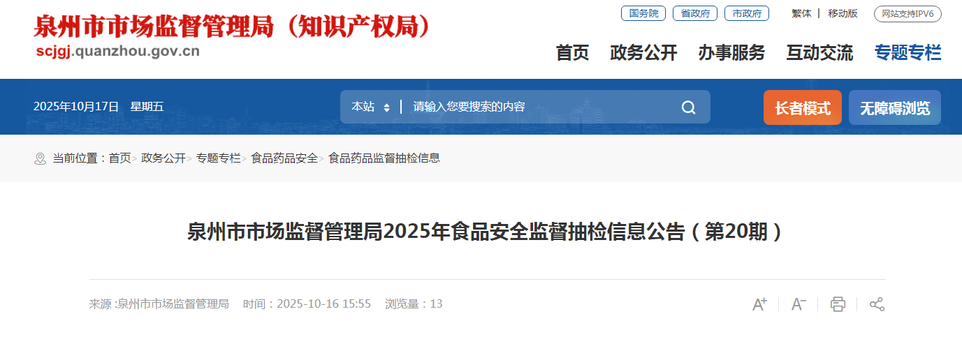 福建省泉州市市场监督管理局2025年食品安全监督抽检信息公告(第20期)