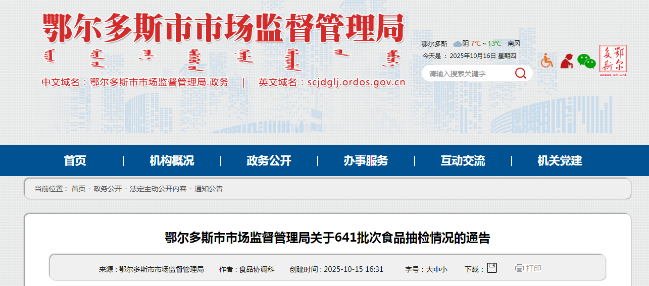 内蒙古鄂尔多斯市市场监督管理局关于641批次食品抽检情况的通告