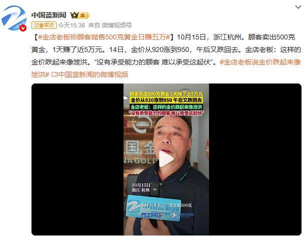 大象新闻2025-10-15 23:53:59 10月15日 浙江杭州 顾客卖出500克黄金 1天赚了近5万元 来源 | 中国蓝新闻 主编 | 彭丹 编辑 | 蒋黎明 rg 14日,金价从920涨到950,午后又跌回去。金店老板:这样的金价跌起来像泄洪。"没有承受能力的顾 客 难以承受这起伏"。 10月15日,品牌金饰最高1235元/克,40年的杭州黄金回收商感叹:普通人一个月工资只能买3克黄金。 现在年轻人结婚只能租黄金戴戴,戴几天再还回去! ...