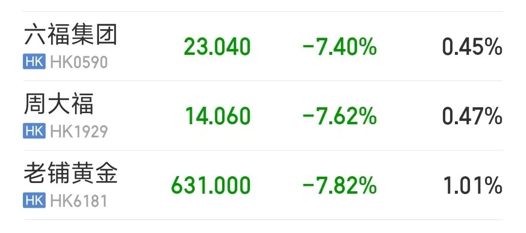 每经编辑|陈柯名 潘海福 11月3日,港股黄金零售品牌商集体下挫。截至发稿,老铺黄金、周大福、六福集团大跌超7%,周生生跌超6%。 | 六福集团 | 23.040 | -7.40% | 0.45% | | --- | --- | --- | --- | | HK HK0590 | | | | | 周大福 HK HK1929 | 14.060 | -7.62% - | 0.47% | | 老铺黄金 HK HK6181 | 631.000 - | -7.82% - | 1.01% | 此外,A股方面,贵金属板块领跌。截至发稿,湖南黄金跌超4%,晓程科技、山金国际跌超2%、中金黄金跌1.94%。 | 名称/代码 | 最新 ◆ · 涨幅 ◆ 5日涨幅 ◆ ▶ | | --- | --- | | 四川黄金 | 27.01 -1.10% -0.41% | | 001337 | | | 领涨龙头3 | | | 西部黄金 | 27.16 -1.24% -3.66% | | 601069 | | | 招金黄金 | 11.94 -1.49% -0.50% | | 000506 | | | 山东黄金 | 35.45 -1.64% ...