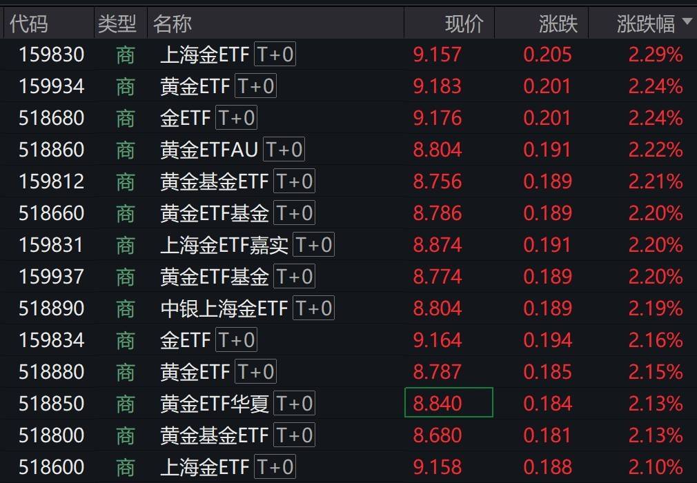 | 代码 | 类型 | 名称 | 现价 | 涨跌 | 涨跌幅 ▼ | | --- | --- | --- | --- | --- | --- | | 159830 | 商 | 上海金ETF T+0 | 9.157 | 0.205 | 2.29% | | 159934 | 商 | 黄金ETF T+0 | 9.183 | 0.201 | 2.24% | | 518680 | 商 | 金ETF T+0 | 9.176 | 0.201 | 2.24% | | 518860 | 商 | 黄金ETFAU T+0 | 8.804 | 0.191 | 2.22% | | 159812 | 南 | 黄金基金ETF T+0 | 8.756 | 0.189 | 2.21% | | 518660 | 商 | 黄金ETF基金 T+0 | 8.786 | 0.189 | 2.20% | | 159831 | 南 | 上海金ETF嘉实 T+0 | 8.874 | 0.191 | 2.20% | | 159937 | 商 | 黄金ETF基金 T+0 | 8.774 | 0.189 | 2.20% | | 518890 | 商 | 中银上海金 ...