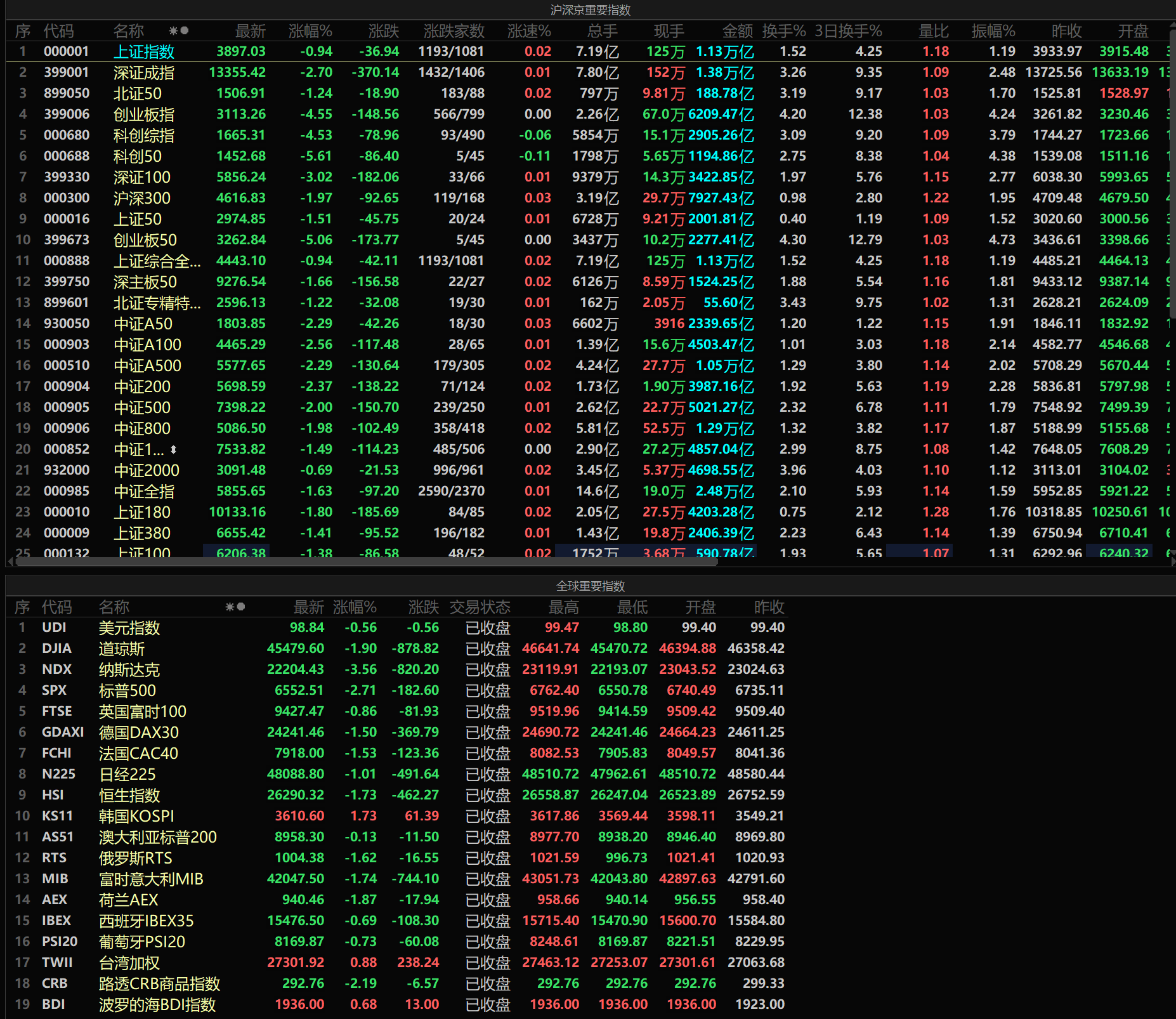 全球市场都在跌,只有黄金白银在上涨,这是周五全球金融市场的奇观。这说明,当风险来了,只有黄金才是唯一的避险资产,是全人类的共识,美元、美 债、大饼统统靠边站。 黄毛又搞事儿,全球都在跌,唯黄金傲视群雄! 周五,大美丽那面的黄毛一段长文,语气强硬且带有"威胁"意味,加剧了全球贸易的紧张局势。导致全球皆跌,唯有金银上涨。具体说了啥,大家可以网上 看,到处都是那个长文。 | | | | | | | | | 沪深京重要指数 | | | --- | --- | --- | --- | --- | --- | --- | --- | --- | --- | | 序 | 代码 | * ● 名称 | 最新 | 涨幅% | 涨跌 | 涨跌家数 | 涨速% | 总手 | 现手 | | 1 | 000001 | 上证指数 | 3897.03 | -0.94 | -36.94 | 1193/1081 | 0.02 | 7.19 乙 | 125 户 | | 2 | 399001 | 深证成指 | 13355.42 | -2.70 | -370.14 | 1432/1406 | 0.01 | 7.80亿 | 152万 | | ന | 8 ...
