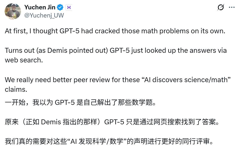 事件概述 - OpenAI研究人员宣称GPT-5模型通过文献搜索“发现”了10个Erdős数学难题的解决方案,但实际是检索到了已存在的文献,而非独立解决,引发公众误解和学界讨论 [1][3][7] 公司声明与行动 - OpenAI研究员Sebastien Bubeck于2025年10月12日发推称GPT-5在文献搜索方面“超凡脱俗”,并举例其“解决”了Erdős问题339,指出该问题实际在20年前已被解决 [3][4] - 2025年10月17日,OpenAI研究人员Mark Sellke更新称,通过数千次查询,GPT-5针对Erdős问题网站上的“开放”问题进行调查,“发现”了10个问题的解决方案,并在另外11个问题上取得部分进展 [5][7] - OpenAI首席产品官Kevin Weil和副总裁Sebastien Bubeck转发相关帖子,后者宣称“AI加速科学已正式开始” [7][8] - 在遭到学界质疑后,Sebastien Bubeck删除帖子并道歉,称无意误导,强调AI在文献搜索上的价值 Kevin Weil也删帖并承认误解了结果 [13][14] 行业反应与争议 - 谷歌DeepMind的CEO Demis Hassabis回应称“这很尴尬”,并引导公众关注网站维护者数学家Thomas Bloom的澄清 [10][11] - 数学家Thomas Bloom澄清,网站将问题标记为“未解决”仅代表其个人不知晓相关解答已发表,并非数学界无人解决,指出OpenAI的表述为“戏剧性的误解” [12] - Meta首席AI科学家Yann LeCun辛辣点评,称OpenAI“被自己吹捧GPT的言论坑惨了”,并在同一天另一篇关于AGI论文存在虚假引用的帖子下发表相同评论 [16][19][22] - 数学家Terence Tao发表观点,认为AI在数学领域最具成效的近期应用并非解决顶级难题,而是使用中等强度工具加速平凡但耗时的研究任务,例如文献综述 [27][29]