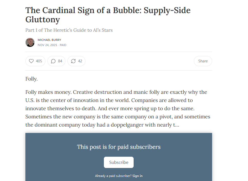 "这一次没有什么不同,无论多少人试图证明。再一次,有一个思科处于这一切的中心,它为所有人提供'镐和铲子',并伴随着宏大的愿 景。它的名字叫英伟达。" 在经历了基金注销传闻与"做空AI金额被媒体夸大百倍"的闹剧后,电影《大空头》原型、知名投资者Michael Burry于当地时间11月24日兑 现承诺,准时"回归"。 这一次,他并未如传言般通过巨额期权做空市场,而是选择通过首篇专栏文章《泡沫的主要迹象:供给侧的暴食》(The Cardinal Sign of a Bubble: Supply-Side Gluttony)来表达"做空AI"的观点。 Burry在这篇文章中,正式向当下的AI热潮宣战,而风暴的中心正是英伟达。他直指英伟达即是当年的思科。 核心论战:英伟达就是当年的思科 针对近期市场认为"科技巨头盈利能力强,因此不存在泡沫"的主流观点,Burry在文中进行了针锋相对的反驳。他列举了1999年互联网泡 沫巅峰时期的数据指出,当年的繁荣同样是由高利润公司推动的,而非仅仅是那些甚至没有收入的小网站。 他在文中写道: "并不像人们以为的那样是由无利可图的网络公司驱动,1999年强劲的纳斯达克指数是由当时高利润 ...
