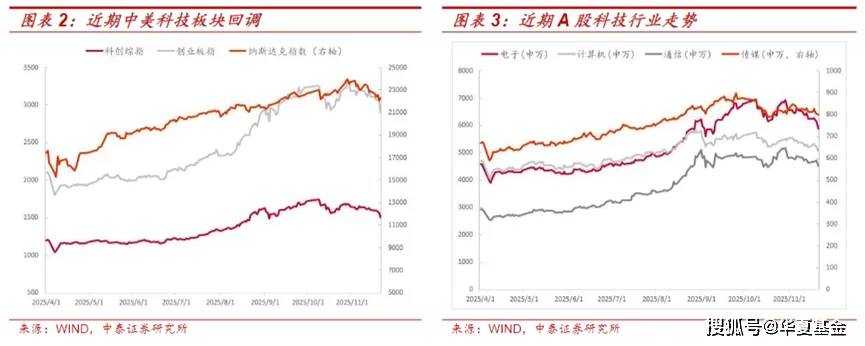 来源:东吴研究所 核心观点 核心观点:美联储鹰派信号、BLS延期公布11月非农数据令市场对12月降息预期一度大幅收窄,叠加AI 泡沫担忧等因素,美股大幅回调;而9月疲软的非农数据、美股调整引发的金融条件收紧和美联储Fed Put预期再度带动降息预期升温。向前看,在重要数据的缺席下,出于谨慎降息原则,我们倾向于12月 美联储将暂停降息;但更重要的是,此次暂停更多是"跳过"而非取消,若12月暂停降息,则美联储有很 大概率将在明年1月执行降息。 大类资产:美联储鹰派信号、AI泡沫论的发酵、年末买盘疲软等因素共同带动美股大跌,全球股市同 步回调。前半周,美联储10月会议纪要显示委员对于12月降息谨慎,美联储官员陆续发表鹰派发言,加 之BLS公告11月非农数据将延后至12月16日发布(在12月FOMC会议之后),重要数据的缺席令市场对 美联储降息预期大幅回撤,12月降息预期一度降至仅25%;后半周,周四公布的9月非农数据好于预 期、但失业率意外上升,降息预期有所升温;但当日在AI泡沫担忧的发酵、年末买盘疲软等因素作用 下,美股意外大跌。整体来看,全周(11月17日至11月21日)标普500、纳斯达克指数分别大跌1.9% ...