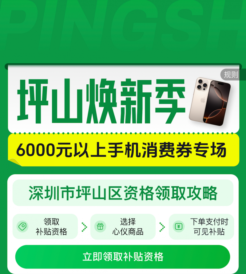 5月14日,深圳市坪山区推出"坪山焕新季"专项活动,活动将针对6000元以上的热门手机推出优惠补 贴。消费者领取活动补贴后,选购6000元以上的手机时,可按商品销售价格立减10%,每单补贴金额不 超过1000元。 2025年,随着手机品类被纳入国家补贴范围,消费者换新机的需求不断增长。据了解,2025年第一季 度,某电商平台国补范围内商品成交额同比增长超过60%。其中,手机成交额同比增长120%,成为消 费者最受欢迎的国补品类之一。 购买6000元以上的手机也能享受优惠补贴了。为落实国家提振消费部署,加快释放以旧换新消费潜力, 经公开遴选,抖音电商成功入选坪山区"手机换新"专项促消费活动电商平台。 为进一步满足不同消费者的需求,深圳市坪山区,针对6000元以上的手机产品推出了"坪山焕新季"专项 活动。此次"坪山焕新季"补贴活动将覆盖6000元以上的高端手机,华为、苹果、小米、荣耀、OPPO、 VIVO等主流品牌旗舰机型均参与活动,全国用户均可领取使用,有望进一步刺激手机消费,满足消费 者的多元化需求。 活动于5月14日18点正式上线,消费者只需在抖音搜索"坪山消费季",即可进入活动专区,领取活动补 贴,每位用 ...