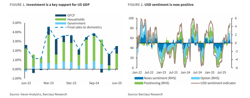 AI投资规模与预期 - 美国科技公司对2025年AI相关资本开支预期已从一年多前的数千亿美元大幅上调至约5000亿美元 [1][2] - 未来五年AI总投资规模预计将超过3万亿美元 按部分估算相当于美国GDP的10%以上 [1][2] - 2025年前两个季度 投资对美国GDP的贡献升至每季度年化1个百分点 为2023年以来的最高水平 [1][2] 对美元汇率的影响 - AI投资热潮带来的增长韧性 利率预期重估以及全球资本流入 正在构成美元的“沉默支撑” [1][6] - 巴克莱的美元情绪指标目前已转为正值区间 表明市场对美元的看法正在改善 [1][2] - 这一趋势强化了美元可能已经见底的判断 美元目前的交易水平强于此前超出市场共识的预期 [1][6] 资本流动渠道 - 通过大规模企业债券发行等渠道 美国正从全球吸纳资本以支持AI基础设施投资 [1][5] - 无论是通过直接参与增发还是反向扬基债券发行 AI投资热潮创造的优势正在将全球资源引向美元 [5] - 这种由企业层面发展引发的全球资本流动构成了对美元实质性但被低估的支撑 [5] 宏观经济与政策影响 - AI投资仍处于加速阶段 其带来的经济产出韧性正在重塑市场预期 [2] - 投资支出的乘数效应可能推动利率预期继续面临现实检验 美联储深度降息周期的概率因此降低 [2] - 增长加速与美国资产的优异表现相伴而行 为美元提供支撑 [2]
