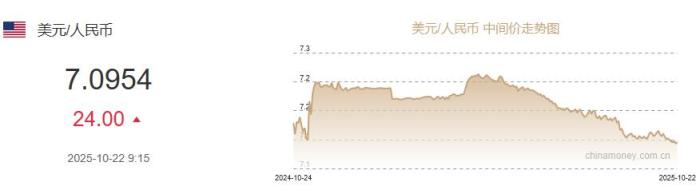 10月22日人民币对美元中间价报7.0954元 下调24个基点