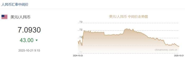随后的两个交易日,中间价连续两日分别调升27个基点和19个基点,于10月20日调降24个基点,21日再 次升值,较前一交易日上调43个基点至7.0930,刷新一年来的新高。 结合年内人民币汇率中间价表现来看,2025年一季度,人民币中间价从7.19附近波动升值,整体围绕 7.17上下波动;进入二季度后,人民币中间价一度贬值至7.21关口下方,年内最低贬值至7.2133。在触 及贬值低点后,人民币中间价再次启动升值走势,突破多个关口后逼近7.10,并突破7.10关口。拉长时 间看,人民币对美元中间价年内涨幅已超900点。 在岸人民币、离岸人民币对美元汇率也双双升值。昨天,在岸人民币对美元收盘报7.1171,较上一交易 日官方收盘价涨60个基点;截至当日18时,离岸人民币对美元报7.1211。2025年以来,在岸人民币、离 岸人民币对美元汇率升值幅度均超过2%,分别为2.94%、2.47%。 内外因素共同助推升值行情 本轮人民币汇率升值的强势表现,得益于内外因素的协同支撑。 本报记者 潘福达 人民币汇率中间价再创阶段性高点。昨天,人民币对美元中间价报7.0930,创下自2024年10月下旬以来 的新高。 自10月 ...