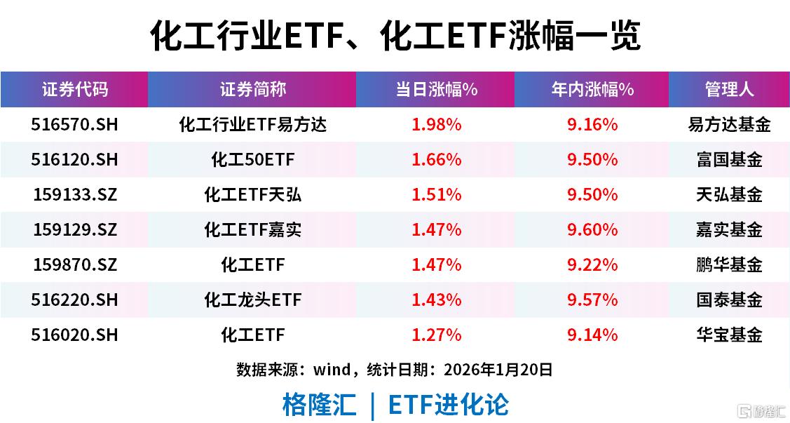 化工板块市场表现 - 2026年1月20日,化工板块继续上攻,反映板块整体走势的化工ETF(516020)盘中场内价格最高涨幅达到1.7%,收盘涨1.27%,收盘价续创2022年8月以来新高 [1][9] - 当日成份股中,涂料、氮肥、石化等板块部分个股涨幅居前,三棵树涨停,鲁西化工飙涨8.89%,卫星化学、恒力石化、彤程新材等涨超6% [1][10] - 自2025年年初至2026年1月20日,化工ETF(516020)标的指数细分化工指数累计涨幅达54.34%,显著跑赢同期上证指数(22.73%)和沪深300指数(19.92%) [2][3][11][13] 资金流向与产品动态 - 化工ETF(516020)近期大举吸金,截至2026年1月19日,近5个交易日有4日获资金净申购,合计净申购额超5.8亿元;近10个交易日有9日获净申购,合计净申购额超11亿元 [4][12] - 化工ETF(516020)跟踪中证细分化工产业主题指数,成份股覆盖AI算力、反内卷、机器人、新能源等热门主题,近5成仓位集中于万华化学、盐湖股份等大市值龙头股,其余5成仓位布局磷肥及磷化工、氟化工、氮肥等细分领域龙头股 [5][14] 行业政策与宏观环境 - 2026年1月14日,工信部等五部门制定《关于开展零碳工厂建设工作的指导意见》,目标到2030年将零碳工厂建设逐步拓展至石化化工等行业,探索传统高载能产业脱碳新路径 [4][12] - 该政策分析指出,石化化工行业新增产能将受限,新建或改扩建项目或需进行碳排放评估,部分地区可能实行“碳排放总量控制”下的配额前置审批,高碳排工艺路线(如煤化工、石油化工)或面临更严格限制,碳交易机制预计将增加企业成本,加速高碳落后产能出清 [4][12] 机构观点与行业周期 - 天风证券指出,从全行业数据看,固定资产完成同比增速在2025年6月进入负值区间,根据历史情况,化工PPI往往滞后约12个月转正,本轮PPI逐步进入周期低点,在2026-2027年“反内卷”、“稳增长”等政策助推下,经济走出谷底、企业盈利底部确认概率较高 [5][13] - 华鑫证券指出,从化工行业三季报业绩表现看,行业整体仍处于弱势,各细分子行业业绩涨跌不一,主要受过去两年产能扩张进入新一轮产能周期以及需求偏弱影响,但部分子行业如润滑油表现超预期,建议重视草甘膦、化肥、进口替代、纯内需、高股息资产等方向投资机会 [5][14] 历史业绩数据 - 细分化工指数近5个完整年度涨跌幅分别为:2021年涨15.72%,2022年跌26.87%,2023年跌23.17%,2024年跌3.83%,2025年涨41.09% [3][11]