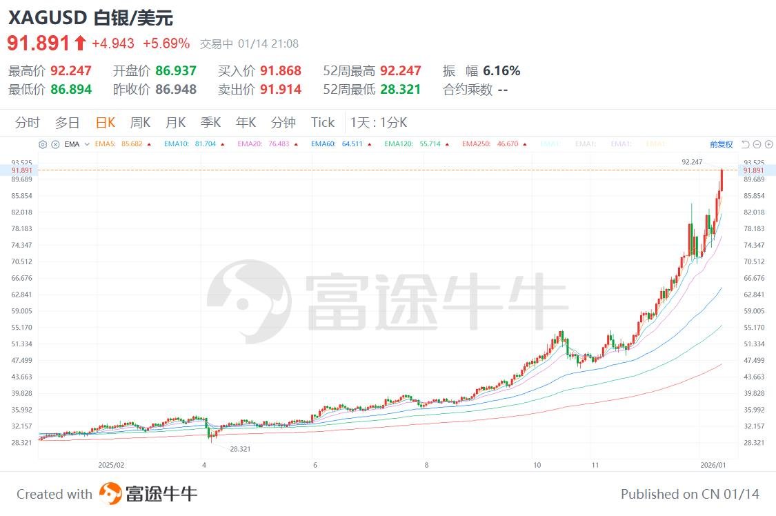 现货白银价格表现 - 现货白银价格突破92美元/盎司的关键整数关口 [1][2] - 日内价格涨幅达到4.79% [1][2]
