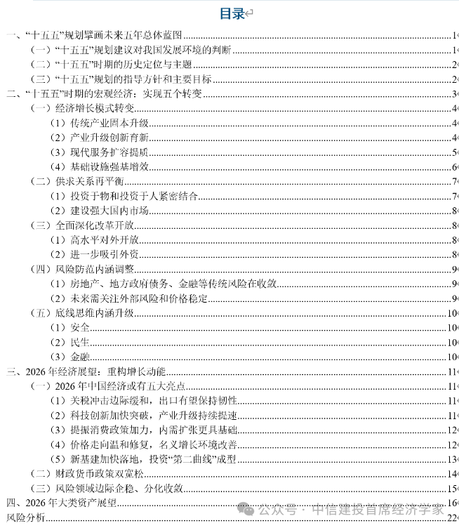 黄文涛、刘天宇、朱林宁(黄文涛系中信建投证券首席经济学家、中国首席经济学家论坛理事) 摘要 核心观点 1. "十五五"时期宏观经济将实现增长模式、供求关系、改革开放、风险重点和底线思维"五个转变"。 2. 2026年是转型升级之年、提振内需之年、风险收敛之年、政策宽松之年。 3. 随着人民币资产重估进一步强化,A股港股的新崛起有"新四牛"逻辑:一是资金流入牛,二是科技创新牛,三是制度改革牛,四是消费升级牛。 摘要 "十五五"时期的中国经济:五个转变 "十五五"规划中新质生产力、民生和安全仍是三大主线。经济将实现"五个转变":经济增长模式转变、供求关系再平衡、全面深化改革开放、风险防范重点 调整、底线思维内涵升级。 2026年宏观经济展望:五大亮点 我国经济增长的内生动能正在深刻重构,向科技创新育新重构,向现代产业体系重构,向强大的国内市场重构,向人力资源开发重构。预计2026年GDP全年 目标为5%。主要有五大亮点支撑: 一是关税冲击边际缓和,中美将进入战术性博弈降温、结构性博弈不改的相对稳定期。外需拖累有望减轻,出口保持韧性。 二是科技创新加快突破,产业升级持续提速。科技创新将从研发端逐步向市场端扩散,带动 ...