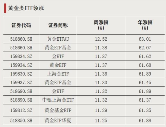 市场整体表现 - 上周A股主要指数普遍回调,上证指数下跌1.47%,深证成指下跌4.99%,创业板指下跌5.71% [1] - 全市场超过1100只ETF下跌,占1300余只ETF的绝大多数 [1] - 上周ETF市场整体资金净流入额超过600亿元 [1] 黄金类ETF表现 - 全市场周涨幅前十的ETF全部为黄金类产品,涨幅均超过10% [1][2] - 截至10月17日,今年内这10只黄金类ETF涨幅均超过60% [1] - 全市场14只挂钩SGE黄金9999指数或上海金指数的ETF上周涨幅全部超过10%,部分基金盘中交易价格超过10元,交易价格全部超过9元 [2][3] - 具体产品如黄金ETFAU(518860.SH)周涨幅达12.52%,年涨幅达63.01% [4] - 黄金类ETF成交活跃,SGE黄金9999指数相关ETF周成交额达1018.85亿元 [7][9] 资金流向分析 - 防御类资产ETF获资金青睐,周净流入额前十的ETF中,黄金类占4只,合计净流入超160亿元 [5] - 黄金ETF(518880.SH)单周净流入额达63.48亿元,银行ETF(512800.SH)净流入52.77亿元 [7] - 恒生科技类ETF同样吸引资金流入,挂钩恒生科技指数的ETF上周合计净流入额超过110亿元,有4只产品净流入额超过15亿元 [6][7] 成交活跃度 - 中证A500指数相关ETF周成交额达1347.4亿元,位居市场首位,其跟踪产品如A500ETF易方达(159361)周成交额超170亿元 [7][8] - 恒生科技指数、香港证券指数、SGE黄金9999指数相关ETF周成交额均超过1000亿元 [7][9] - 香港证券ETF(513090)周成交额达1043.43亿元,位居全市场股票型ETF首位 [8] 机构观点与投资逻辑 - 机构分析认为金价走强受美联储降息释放流动性及各国央行多元化储备以对冲美元信用风险驱动 [5] - 建议关注大盘成长核心资产,因当前核心资产板块估值处于历史低位,具备估值修复弹性,可关注中证A500、沪深300等宽基指数 [10] - 10月市场结构性机会与波动并存,三季报密集披露期可能强化盈利驱动逻辑,景气驱动的科技制造(如半导体、机器人、创新药)和资源品(如有色金属)有望获资金流入 [10] ETF产品动态 - 多只ETF进行分红,科创板50ETF(588080)进行上市以来首次分红,每10份基金份额分红0.14元 [11] - 易方达中证红利ETF联接基金进行分红,每10份基金份额分红0.52元 [11] - 按照红利发放日统计,定档于10月发放红利的ETF产品已超过20只 [11]