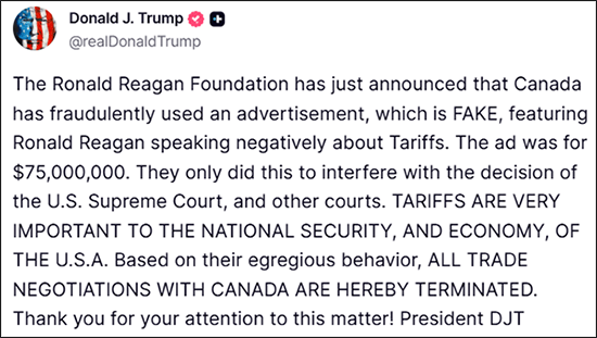 President Donald Trump announced Thursday that trade negotiations with Canada have been terminated over an advertisement featuring former President Ronald Reagan speaking out against tariffs. "The Ronald Reagan Foundation has just announced that Canada has fraudulently used an advertisement, which is FAKE, featuring Ronald Reagan speaking negatively about Tariffs," Trump wrote on Truth Social."The ad was for $75,000. They only did this to interfere with the decision of the U.S. Supreme Court, and other cour ...