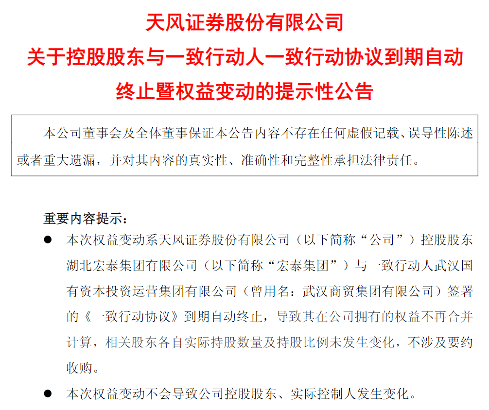 21世纪经济报道记者 孙永乐 持股显著提升,单一控股地位强化 12月29日,天风证券(601162.SH)发布公告称,控股股东湖北宏泰集团有限公司(简称"湖北宏泰集团")与武汉国有资本投资运营集团有限公司(简称"武 国投")签署的《一致行动协议》于12月27日到期自动终止。 市场分析认为,协议到期不影响天风证券的股权稳定性和治理结构。协议首次签署时,湖北宏泰集团持有天风证券13.84%的股份。在与武国投构成一致行 动关系后,双方合计持股比例为22.62%。 2024年以来,湖北宏泰集团通过二级市场增持和认购定增股份持有天风证券的股比已达28.33%。这一比例不仅高于协议签署前其自身的持股数,也高于此 前双方合计的持股数,控股地位更为稳固。 根据公开信息,湖北宏泰集团于2022年通过受让人福医药、湖北联投持有的股权,取得天风证券13.84%的股份。为达到控股要求,其与武国投于2022年10 月首次签署一致行动协议,约定在行使股东权利时以湖北宏泰集团意见为准。 值得一提的是,截至2025年三季度末,天风证券106.78%的净稳定资金率跌破监管预警线,公司流动性困境备受市场关注。今年下半年以来,为化解流动性 困境, ...