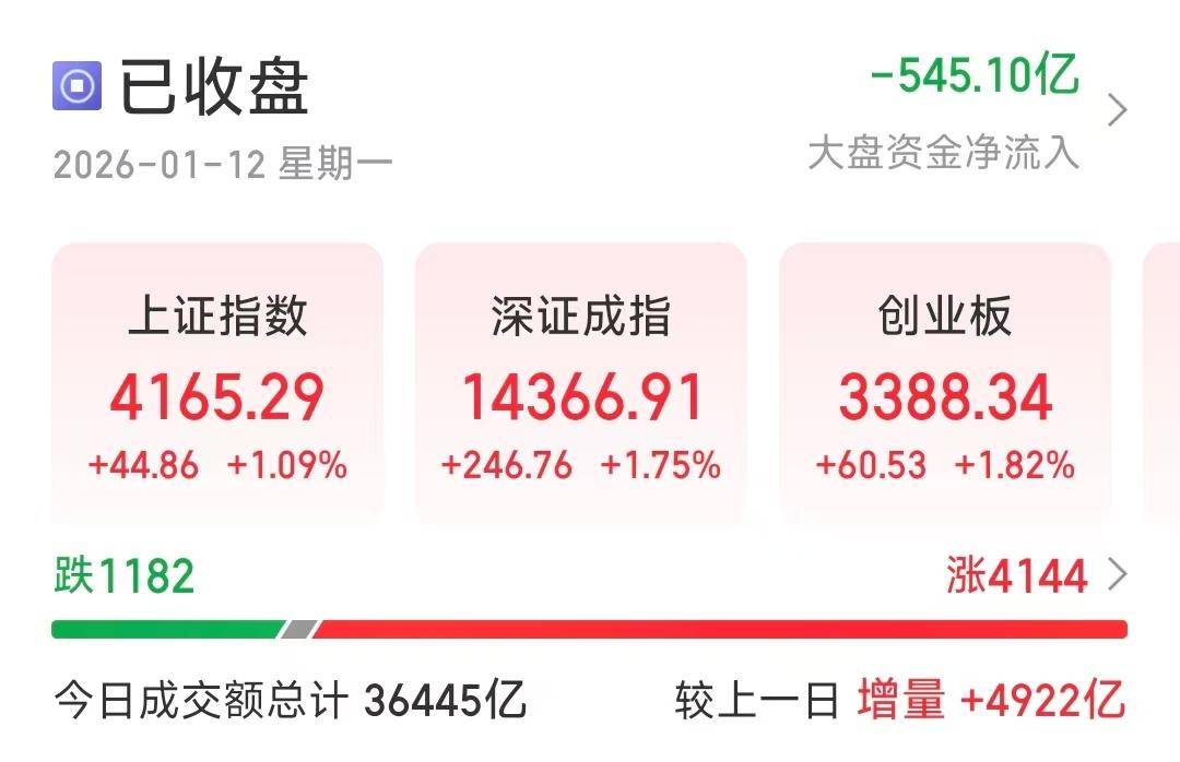 在沪指走出17连阳行情的同时,截至1月12日收盘,沪深两市成交额也达到3.6万亿元,较上一个交易日放量4787亿,刷新成交额历史纪录。截至收盘,沪 指报4165.29点,涨1.09%;深证成指报14366.91点,涨1.75%;创指报3388.34点,涨1.82%。专家认为,连续两个交易日突破3万亿元,表明市场已进入量 价齐升阶段,春季攻势已经展开。 盘面上,商业航天、Sora概念、AI智能体板块涨幅居前,商业航天板块中,天润科技、星图测绘、流金科技等多股30CM涨停领涨,天力复合、富士达、 并行科技等涨超20%;AI智能体板块中,众诚科技、流金科技30CM涨停,蓝色光标、拓尔思、普元信息、科大国创等多股20CM涨停;Sora概念中,福石 控股、易点天下20CM涨停。 前海开源基金首席经济学家杨德龙指出,开年股市牛市行情持续走强,市场放量上涨,连续上攻,沪指实现17连阳,同时连续两个交易日突破3万亿元, 表明市场已进入量价齐升阶段,春季攻势已经展开。杨德龙认为,2026年牛市上涨的逻辑未变,市场有望从跨年度行情过渡到春季攻势。一月份通常是全 年信贷投放最多的月份,规模一般在3至5万亿元左右,其中会有部分资金通 ...