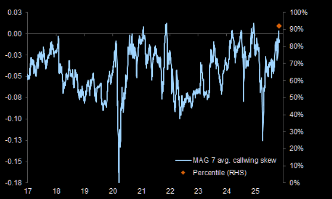 AI投资热度与市场情绪 - 尽管市场经历抛售后各方为AI进行有力辩护,但多项指标显示当前AI投资已达到极端水平[1] - 大型科技股七强(Mag 7)的3个月25 delta看涨期权偏斜度处于历史高位,反映投资者对上涨的极度乐观预期,该指标自2012年5月以来处于91百分位数[2] - 大型成长股和科技股的持仓水平重新回到多季度高点,显示资金大量涌入该领域[4] 投资者行为趋同 - 基本面对冲基金已拥抱高贝塔股票,即大型科技AI宠儿,其偏好股票已与散户投机者趋同[6] - 专业投资与投机资金在同一赛道上拥挤不堪[6] 历史表现与市场波动性 - 历史数据显示AI相关股票曾多次出现相对市场的大幅回调,随后才被资金逢低买入,表明AI投资并非只涨不跌[8] - 市场叙事快速转变,例如从“搜索正在消亡”到“谷歌实际上是AI领导者”的观点在极短时间内发生180度转弯,反映市场情绪的不稳定性[16] 宏观经济与系统性风险 - 家庭股票配置已达创纪录水平,若AI科技估值出现裂缝,仅通过财富效应对消费的冲击就将拖累美国GDP下滑2.9%[10] - 产业集中度加剧系统性风险,英伟达几乎支撑着每一个主要AI参与者(除Anthropic外),供应链结构高度集中[12] 行业信用风险 - 科技行业的信贷风险指标出现分化,其信贷风险急剧上升,而银行业相对平静[18]